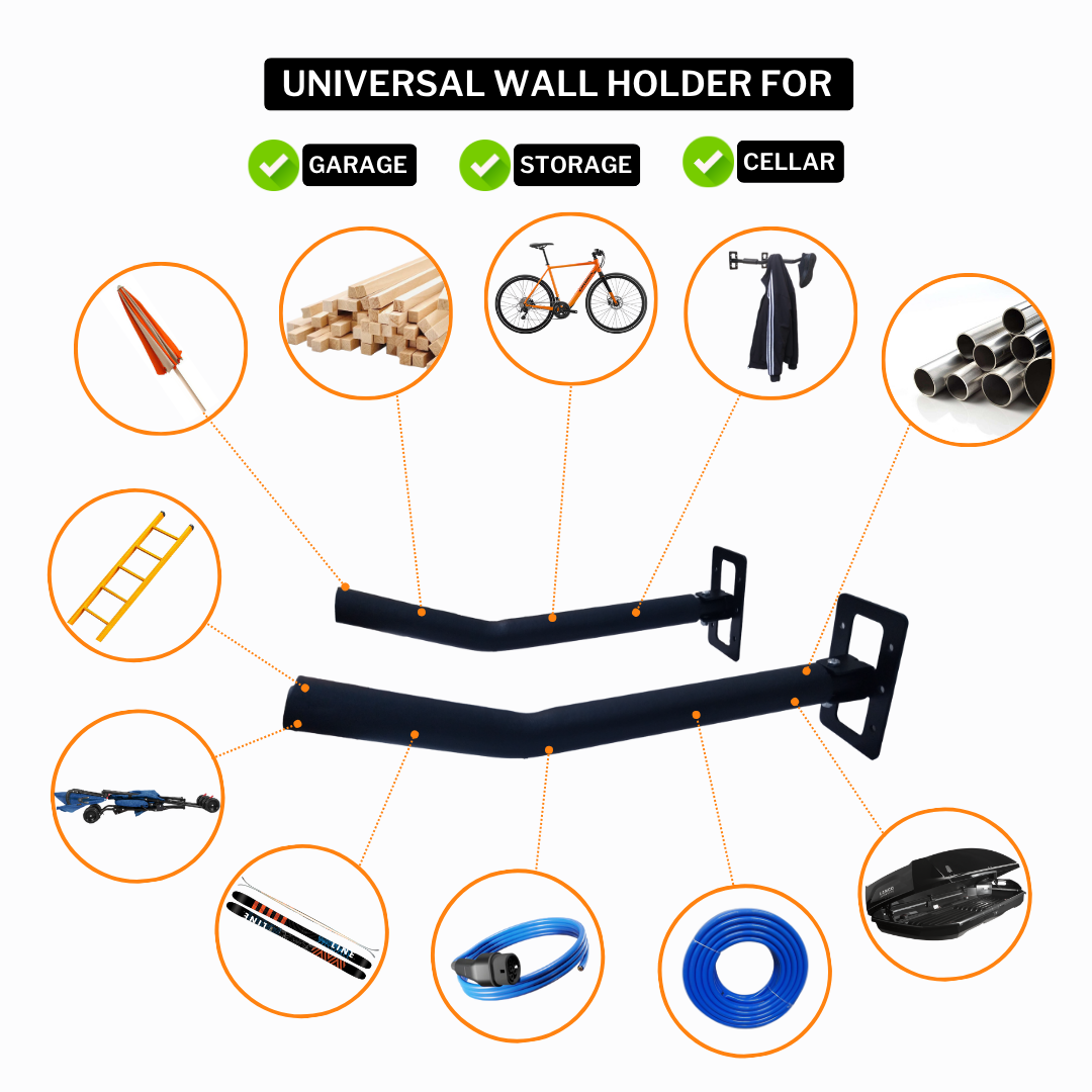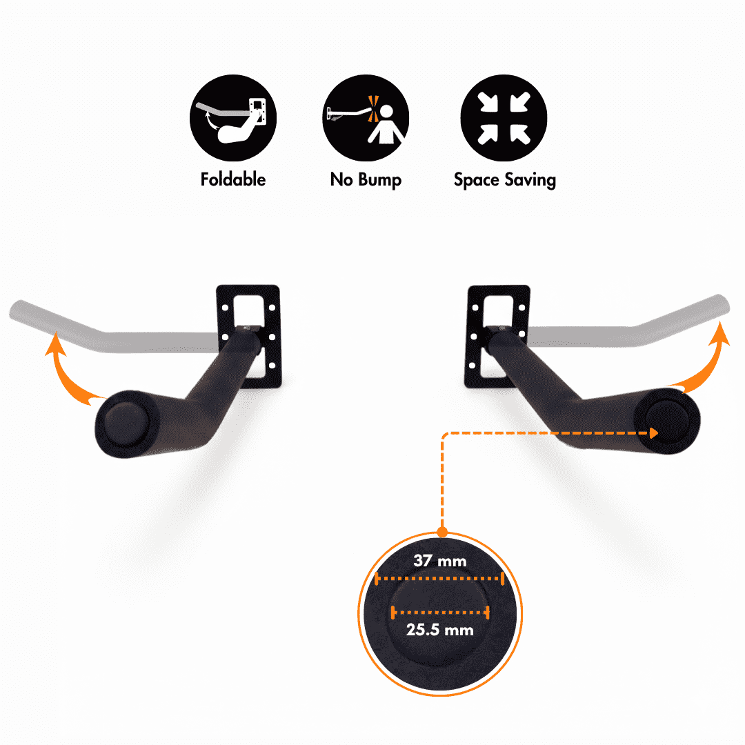 Wall mount holder folds in both directions—left and right—allowing you to tuck it away when not in use and save precious space in your garage or room.