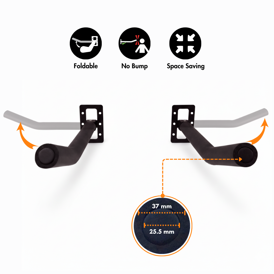 Wall mount holder folds in both directions—left and right—allowing you to tuck it away when not in use and save precious space in your garage or room.