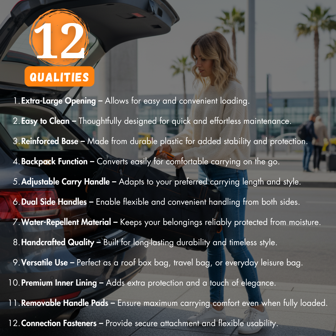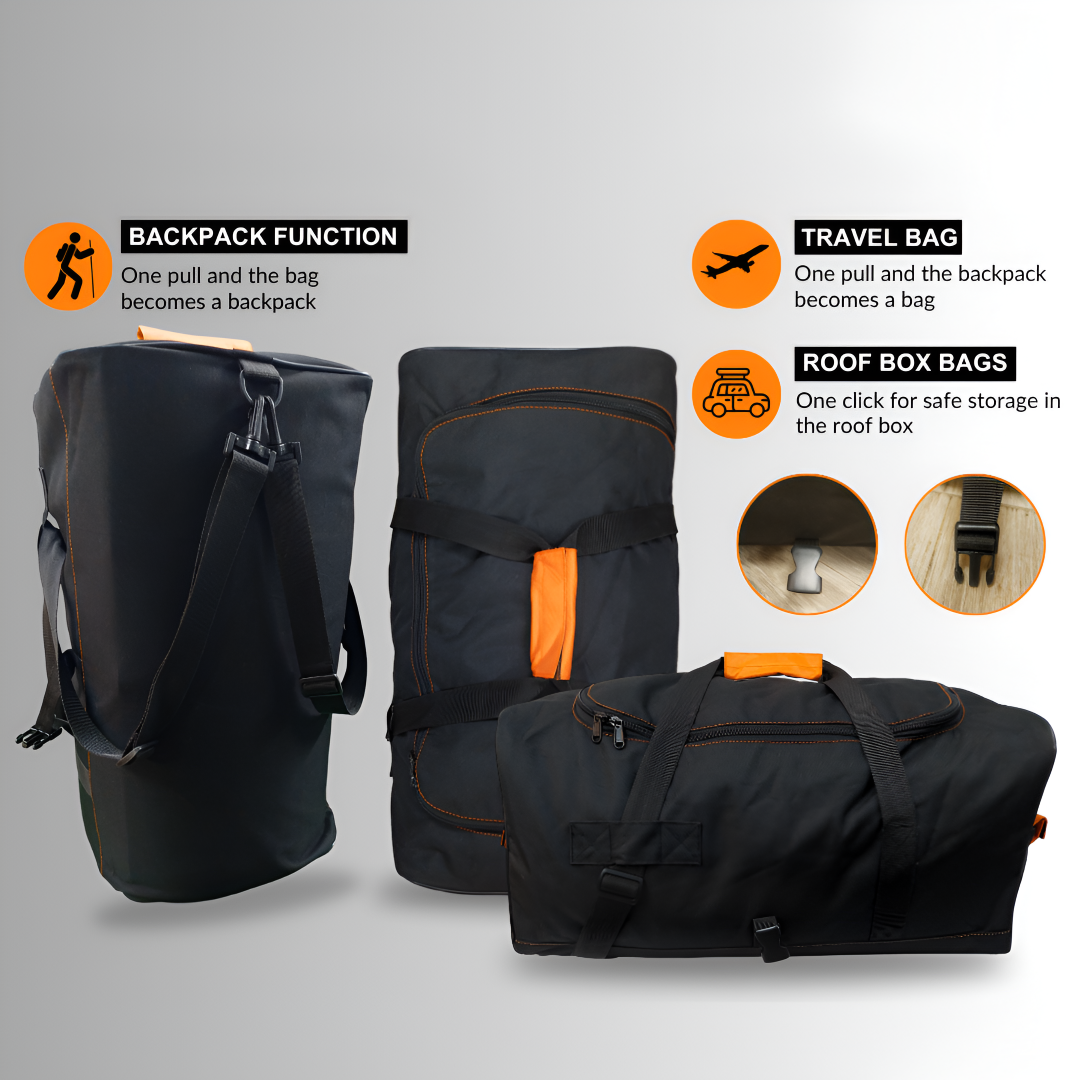 From car to airport to trail—adaptable as a roof box bag, backpack, or travel bag.